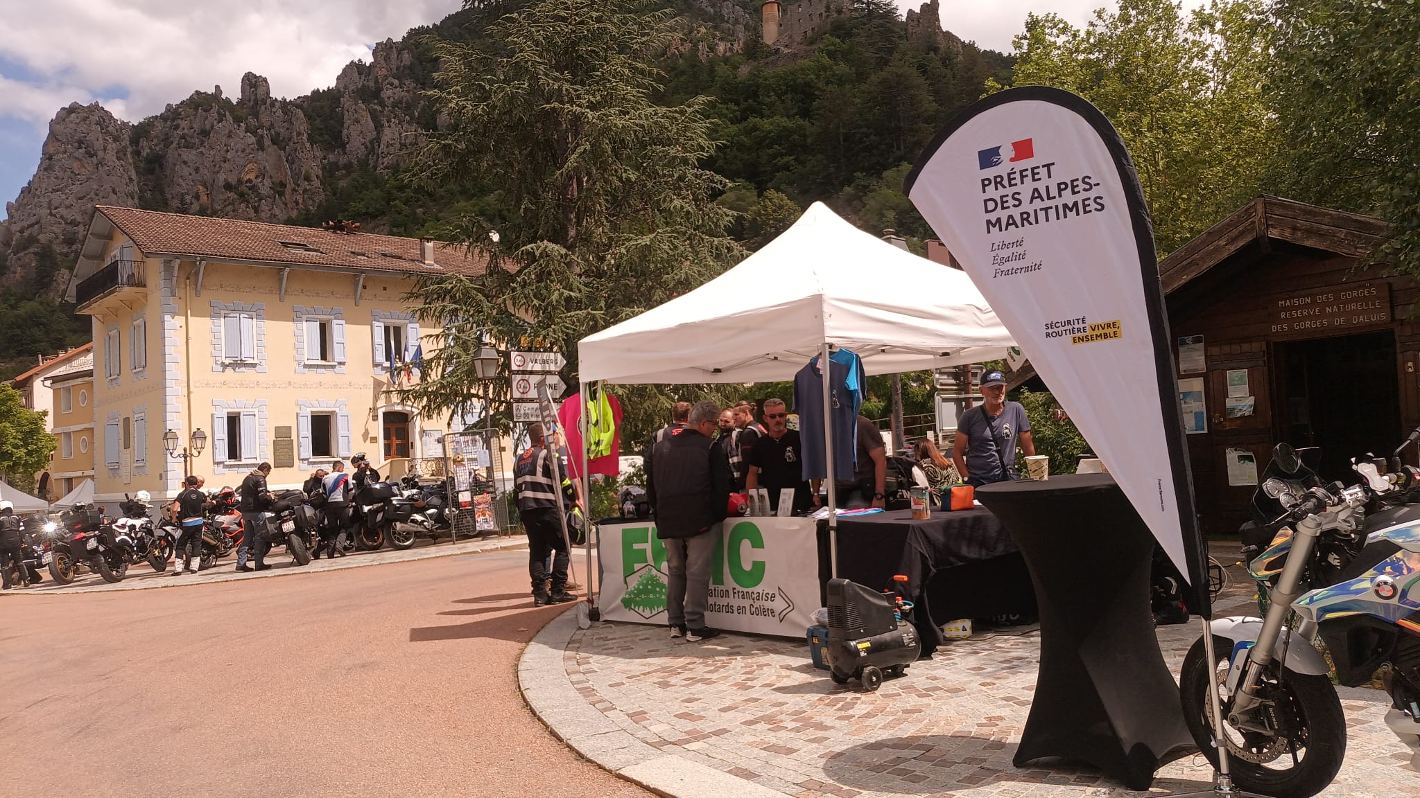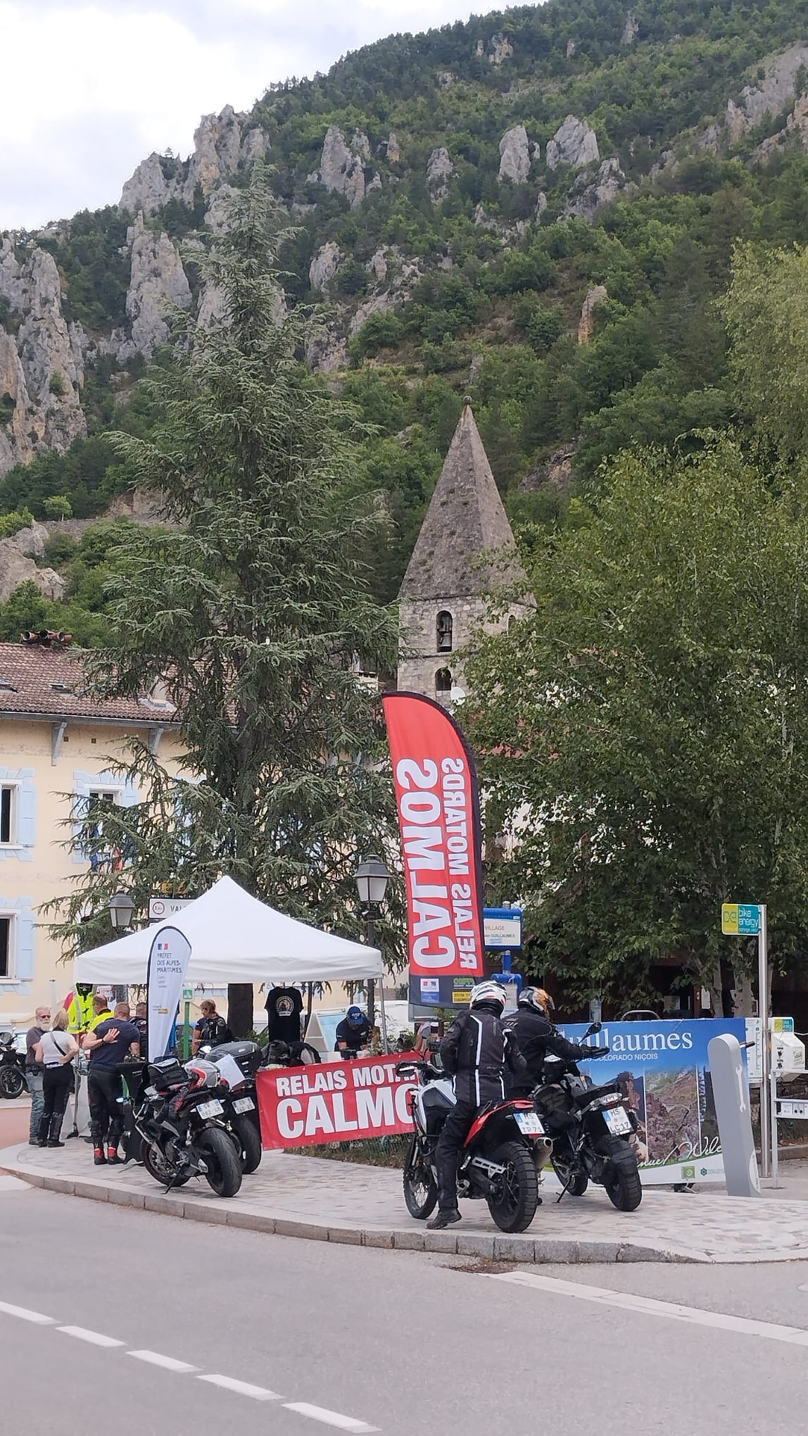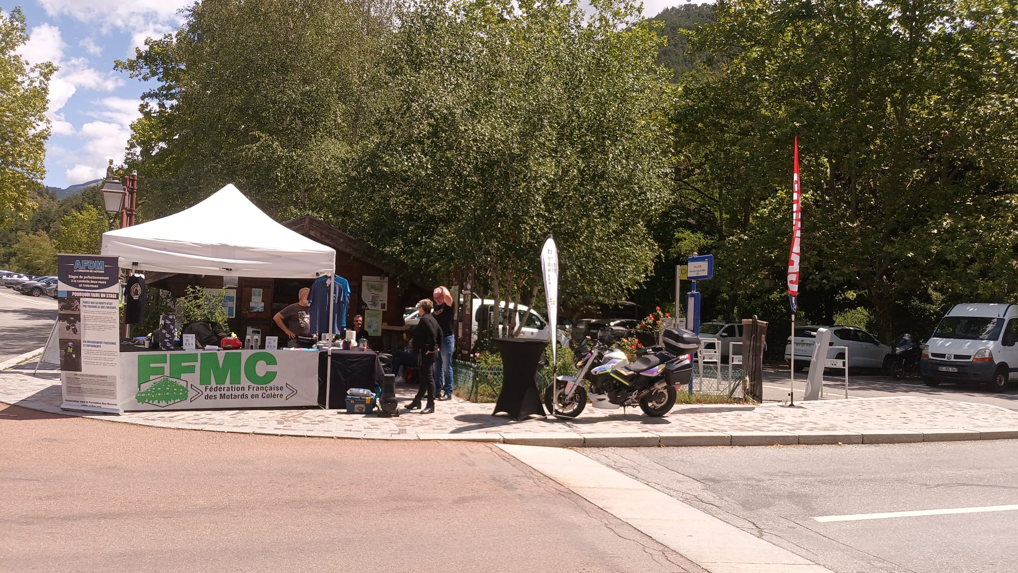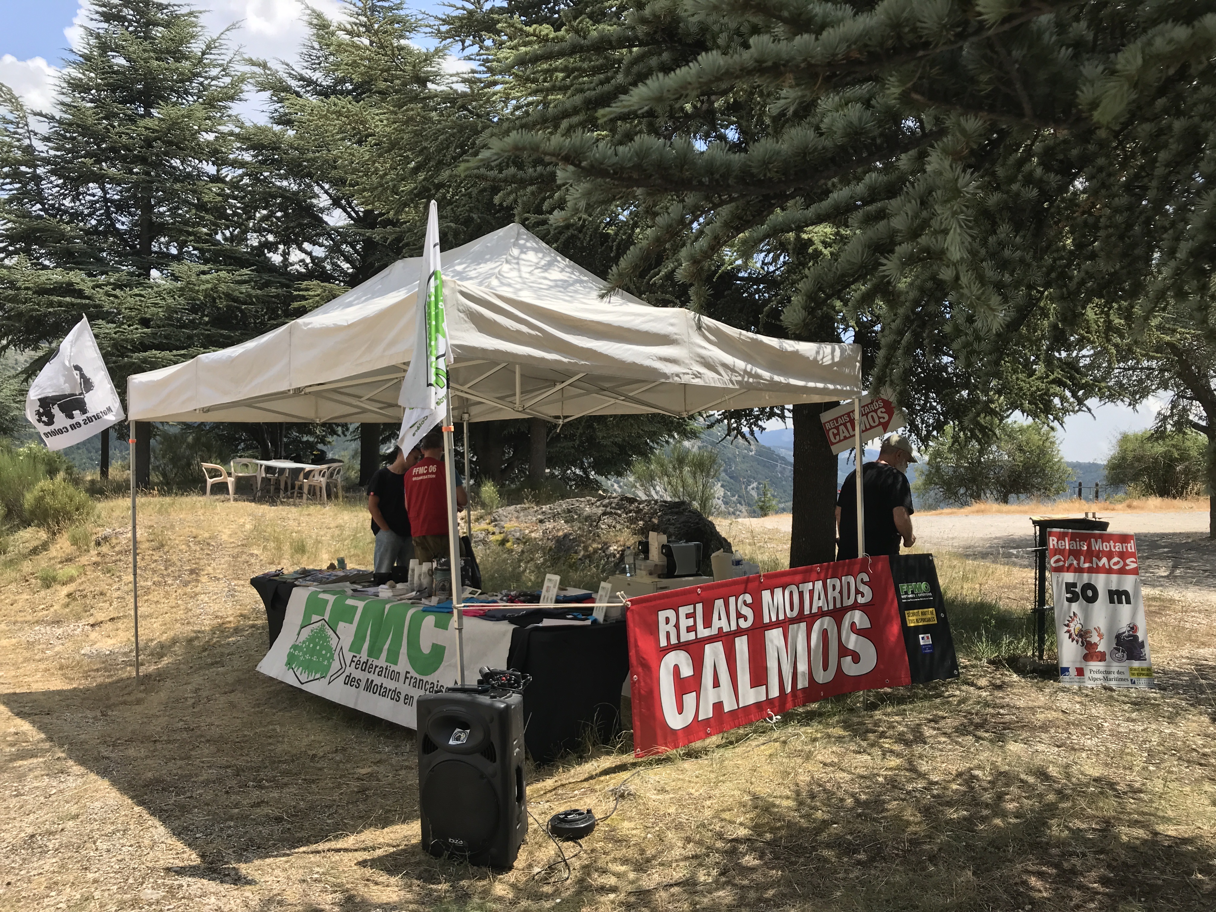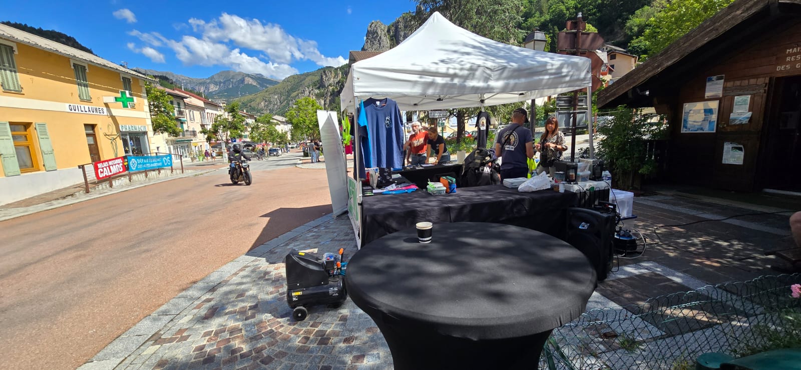 Cette année encore, la FFMC06 organisait un relais Calmos dans le village de Guillaumes sur la Route des Grandes Alpes. Sur les deux jours, plus d'une centaine de motards (109) ont été accueillis avec un café ou une boisson fraîche sur le stand partagé avec la Mutuelle des Motards et l'AFDM (Association pour la Formation Des Motards), comme les montre les images ci-dessous: