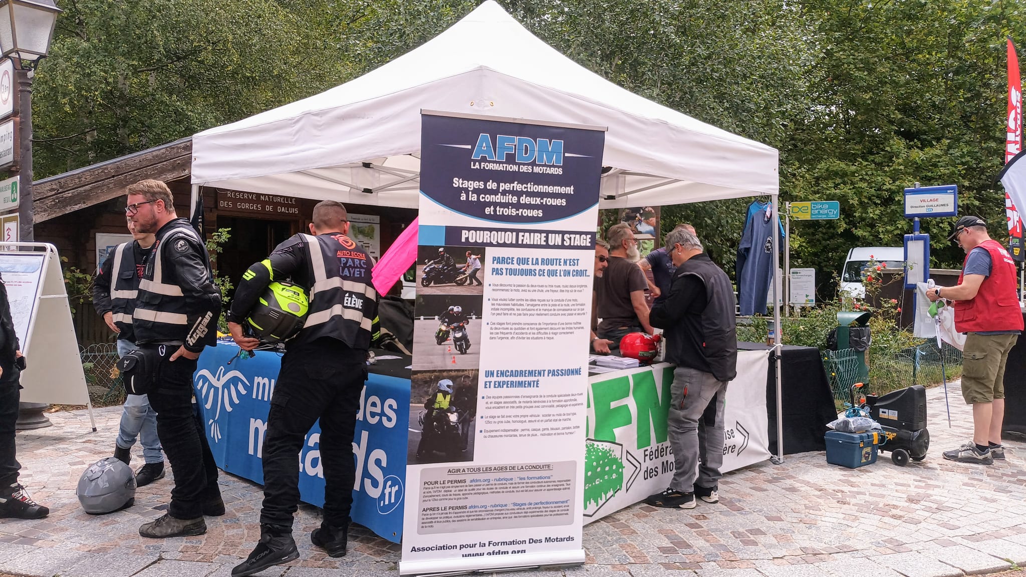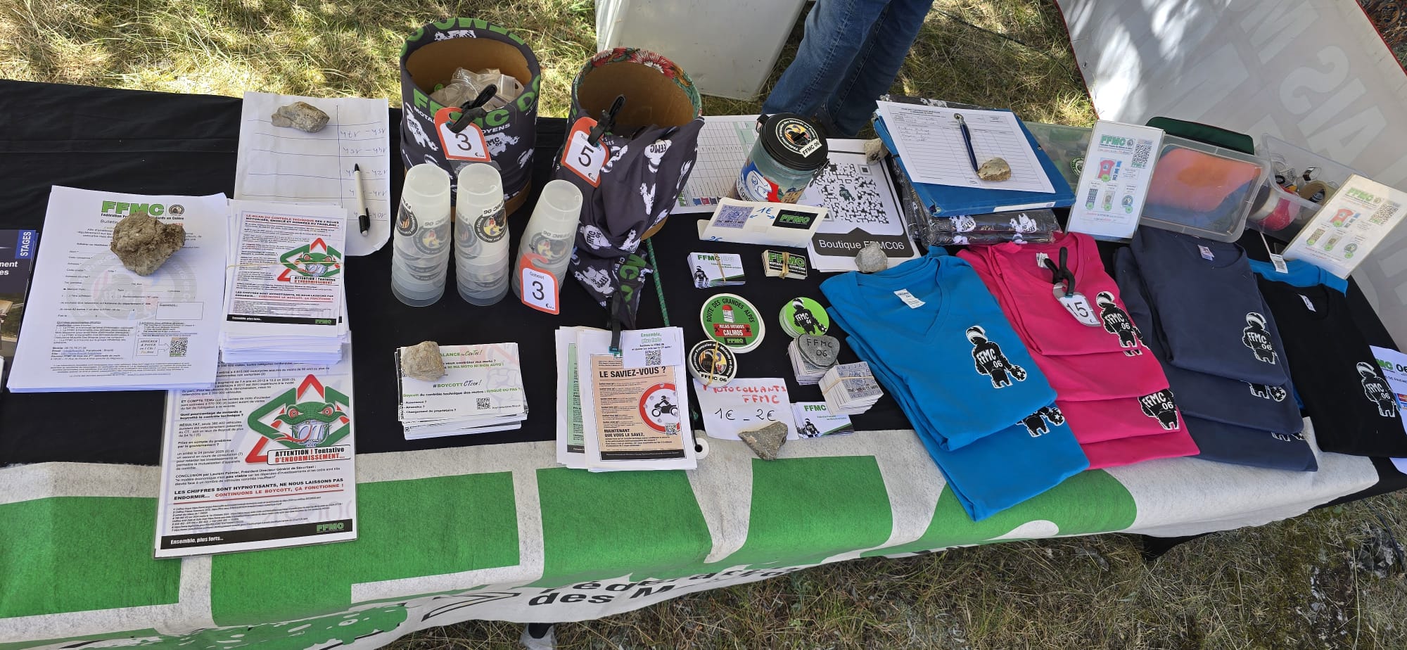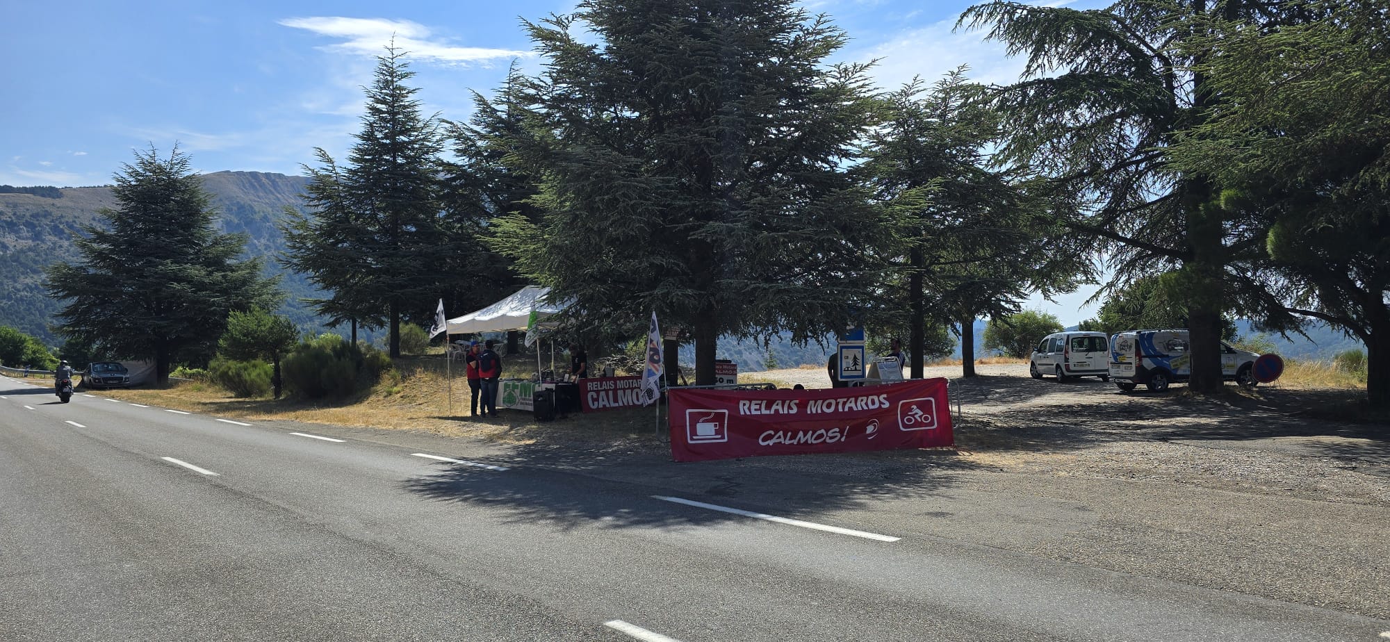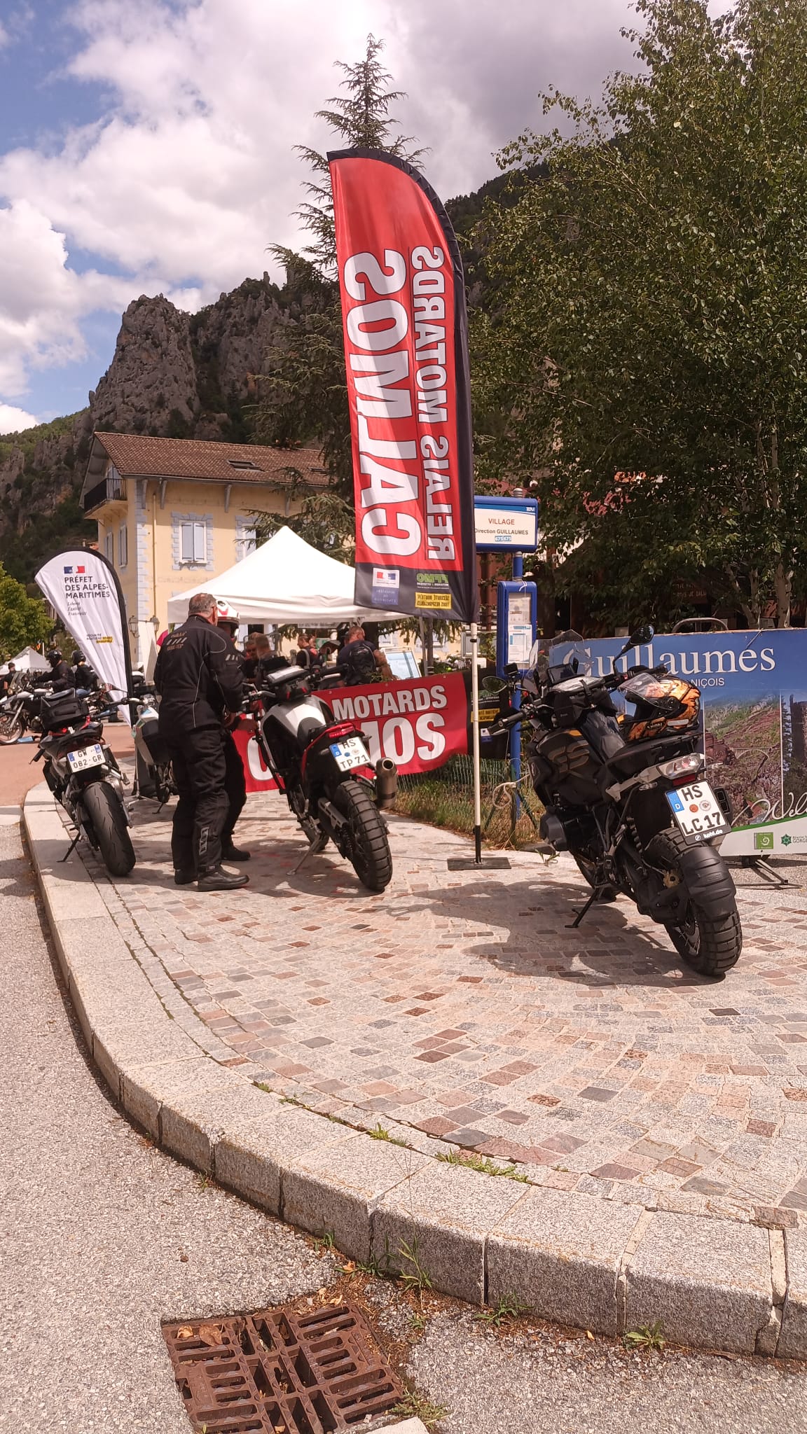 Cette année encore, la FFMC06 organisait un relais Calmos dans le village de Guillaumes sur la Route des Grandes Alpes. Sur les deux jours, plus d'une centaine de motards (109) ont été accueillis avec un café ou une boisson fraîche sur le stand partagé avec la Mutuelle des Motards et l'AFDM (Association pour la Formation Des Motards), comme les montre les images ci-dessous: